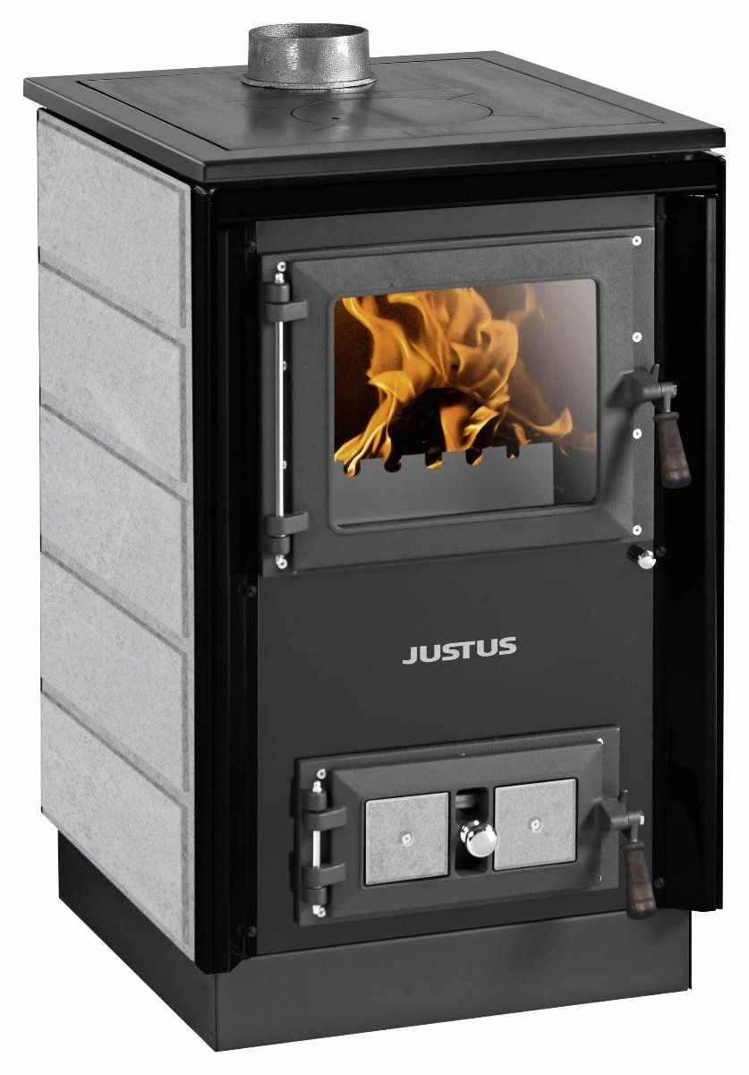 Justus Festbrennstoff-Herd Rustico 90 2.0 Speckstein – Eleganter Holzherd mit Herdrahmen aus Edelstahl.