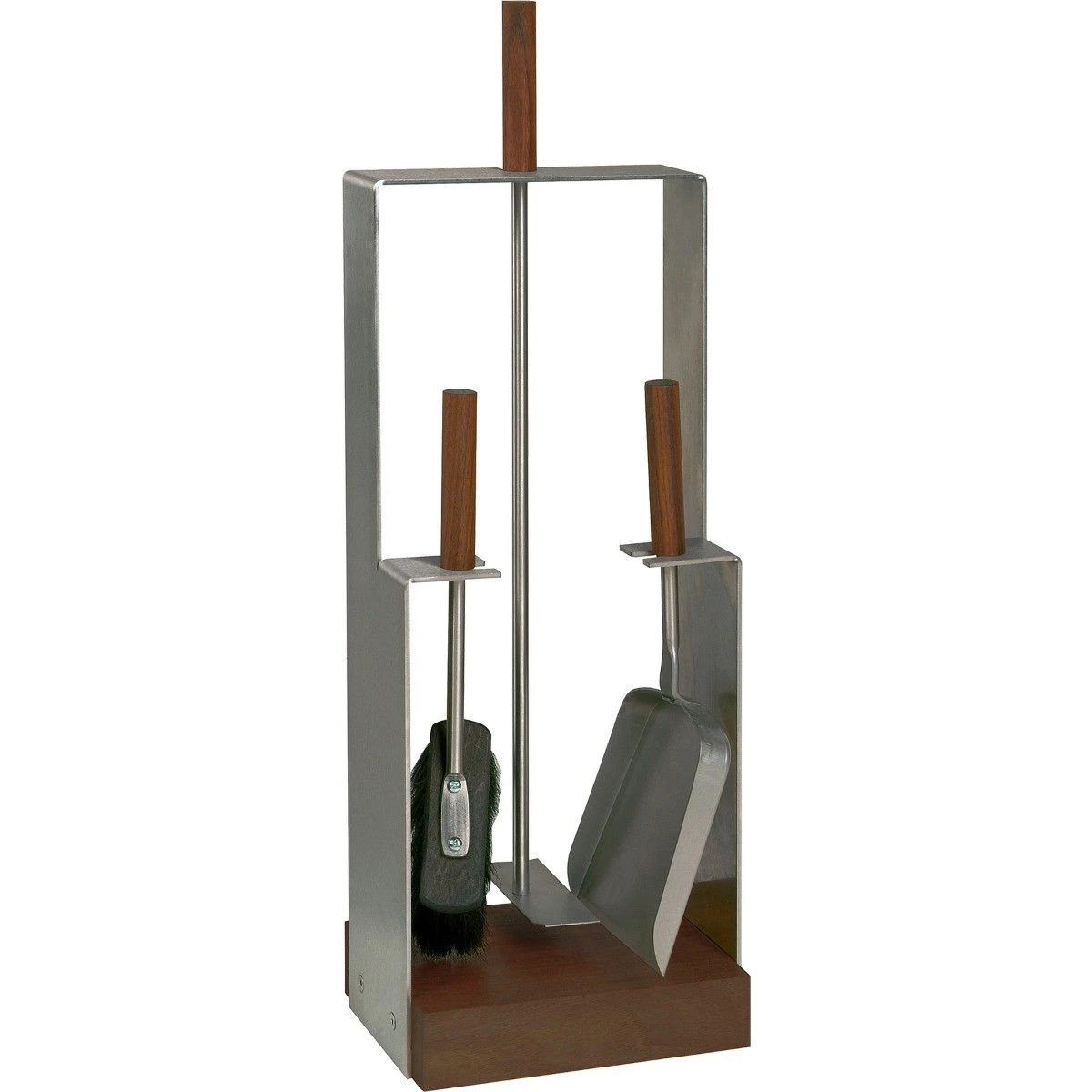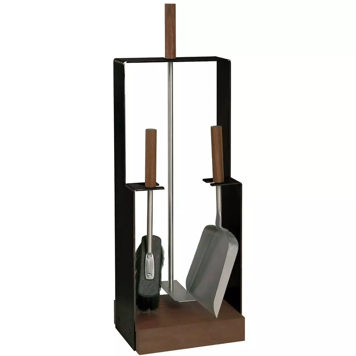 Lienbacher Kaminbesteck in moderner geometrischer Formgebung aus Edelstahl oder schwarz beschichtet, 3-teiliges Besteck aus Edelstahl, Griffe und Sockel aus Nussholz.