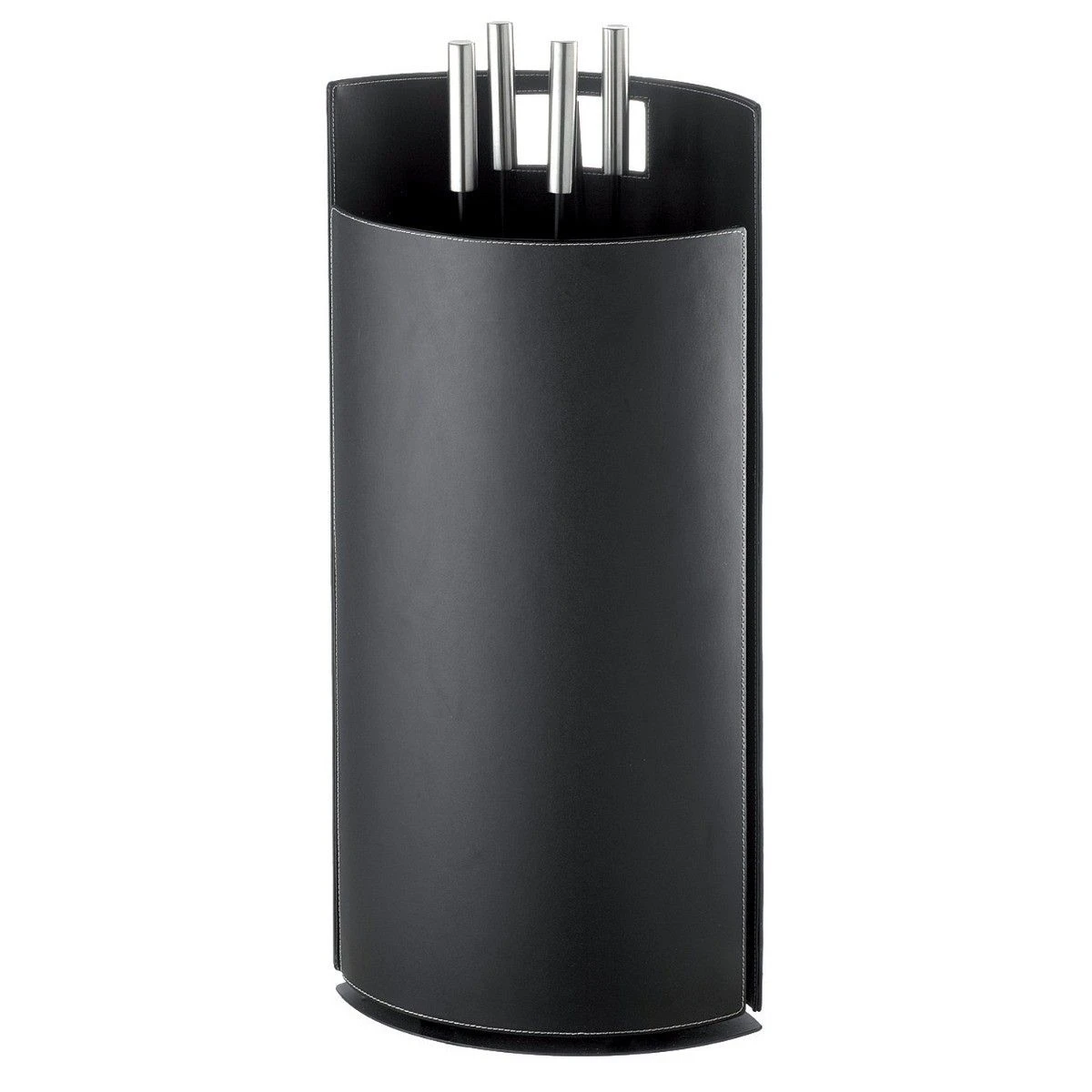 Kaminbesteck 4-teilig mit edelstahlfarbenen Griffen in schwarzem Kunstlederkorb.